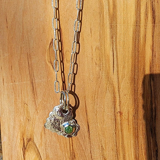 Handmade .999 Pure Silver Textured Heart Pendant Necklace with Green Rhinestone & Heart Clasp