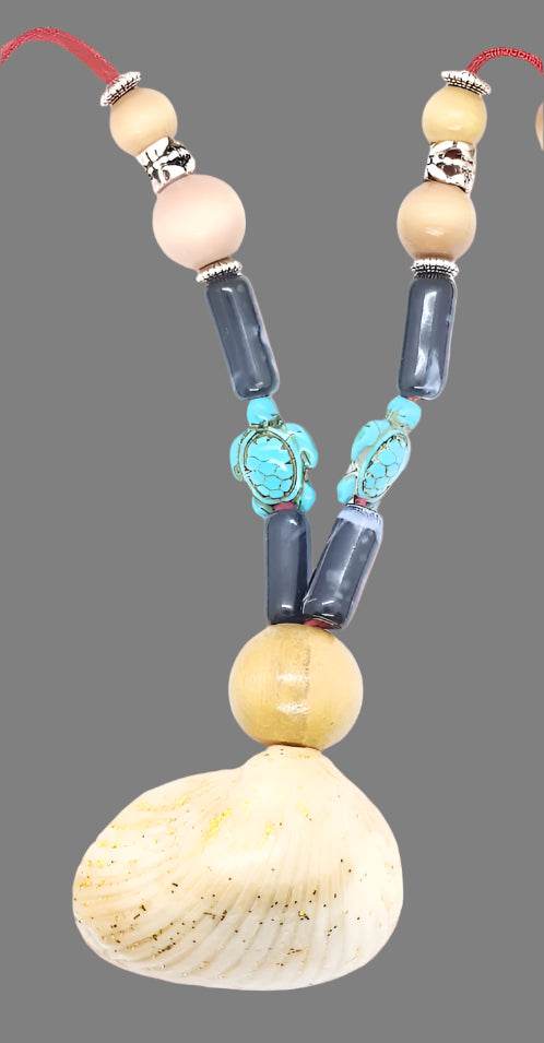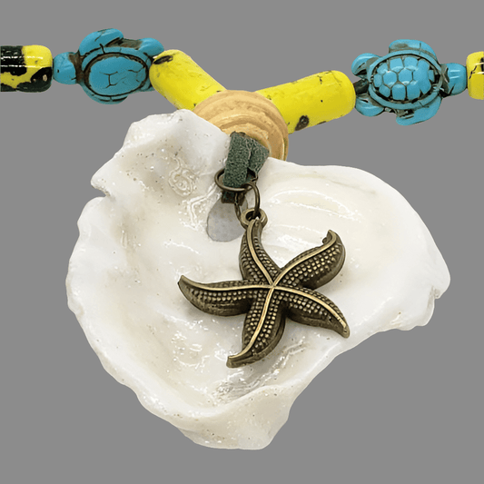 Handmade Long Green Faux Boho Style Necklace with Oyster Shell, Turquoise Howlite Turtle & Starfish Charm