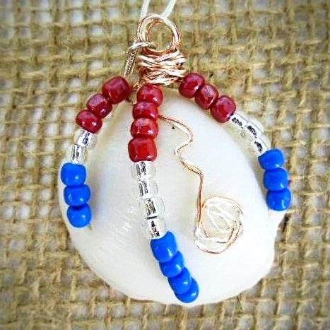 Handcrafted Patriotic Lucina Seashell Necklace - Copper & Silver Wire Wrapped with Glass Beads New