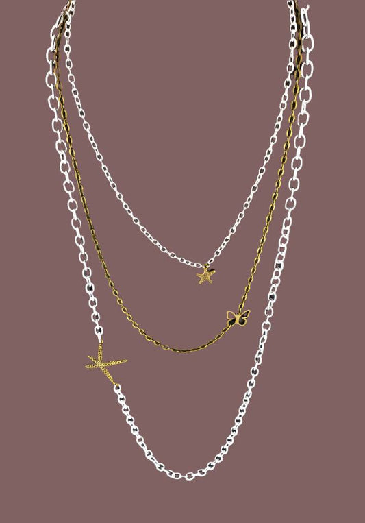 Handmade Boho Style Three-Layer Necklace with Starfish & Butterfly Charms – Vintage & Silver-Colored Chains