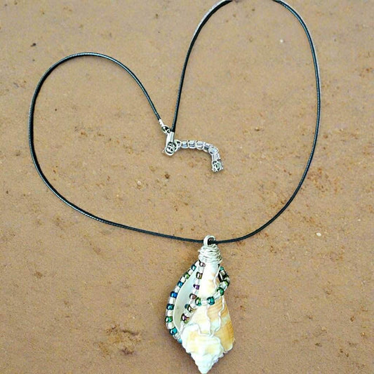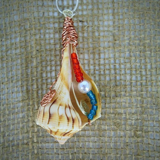 Florida Apple Murex Shell Handmade Beach Boho Pendant-Copper Wire Wrapped-Multi Color Glass Beads- USA Beach Boho