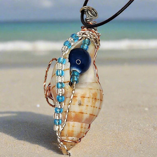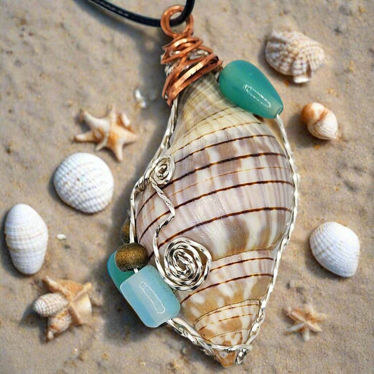 Copper Wrapped Banded Tulip Seashell Handmade Pendant Blue-Green Color-Glass beads-Beach Boho