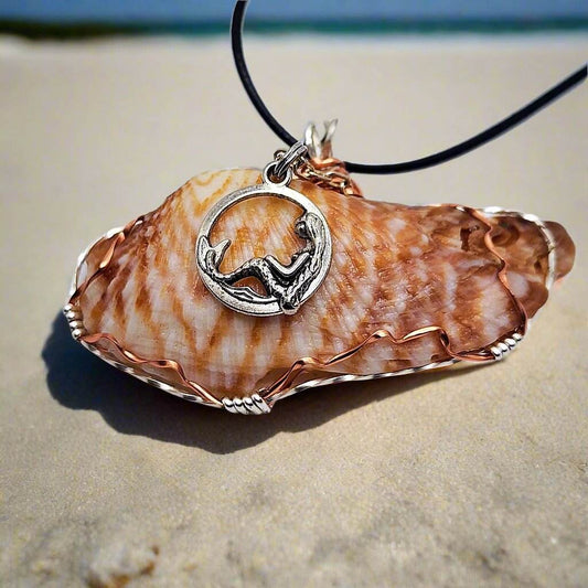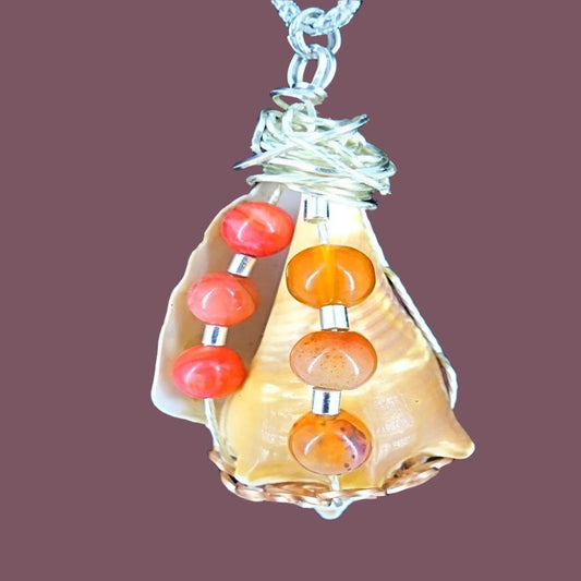 Beautiful Natural Fighting Conch Shell Pendant with Silver & Copper Wire Wrap, Coral-Orange Glass Beads-Handmade