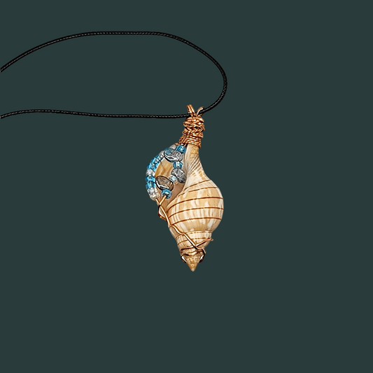 Gorgeous Banded Tulip Shell Handmade Pendant with Copper & Silver Wire Wrap, Blue Ceramic & Glass Beads on Black Rope Necklace