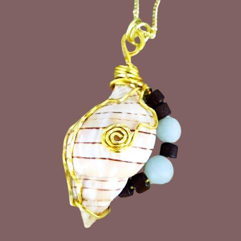 Unique Banded Tulip Seashell Pendant with Gold Tone Wire Wrap & Green Glass Beads on Gold Plated Brass Necklace-Beach-Boho
