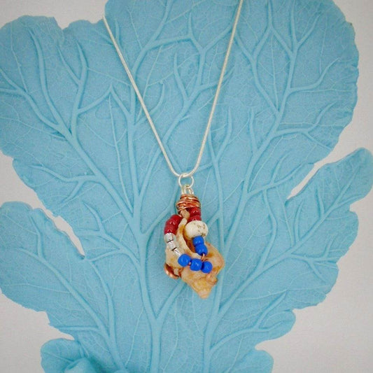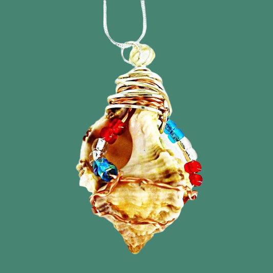 Handcrafted Apple Murex Shell Necklace - Copper & Silver Wire Wrapped with Red, White & Blue Glass Beads