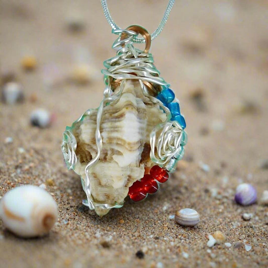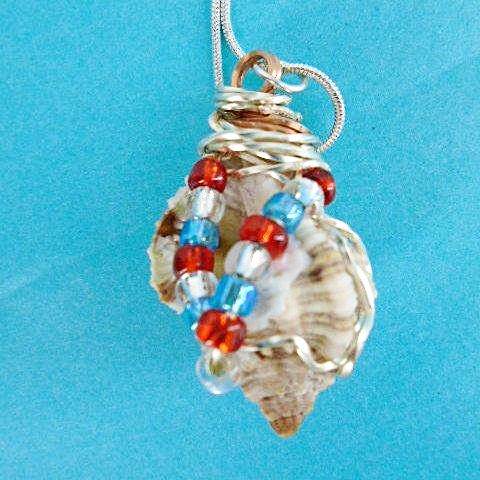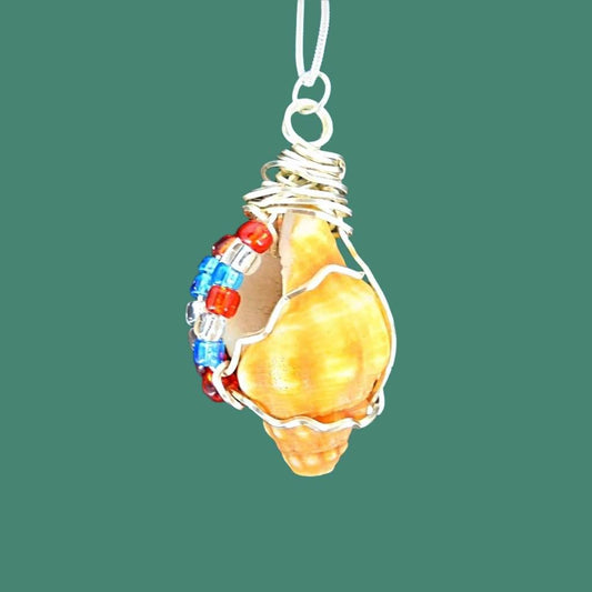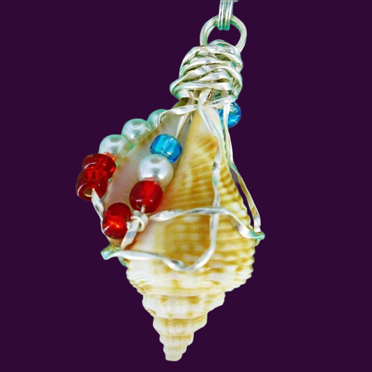 Handcrafted Natural Apple Murex Seashell Pendant - Silver Wire Wrapped with Red, White & Blue Glass Beads