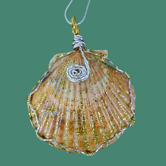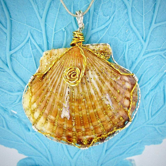 Handmade Large Orange/Gold Scallop Seashell Pendant with Gold Glitter, Clear Glaze, and Wire Wrap on Black Leather Rope