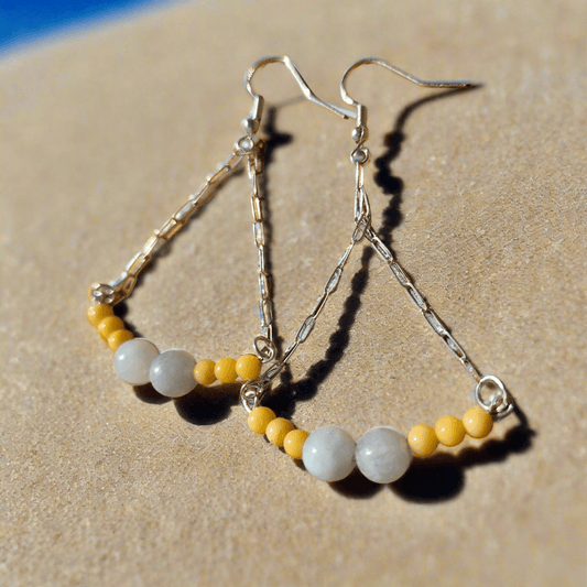 Natural & Dyed Mother of Pearl Earrings with Yellow Jasper Beads - S-Style, 3” Long Handmade Earrings
