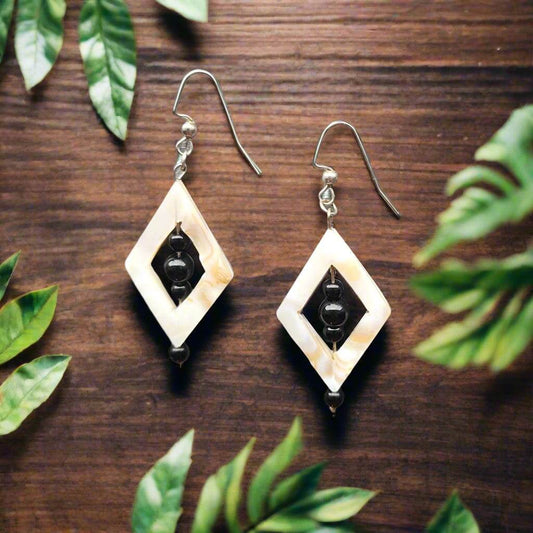 Handmade Mother of Pearl Diamond-Shaped Earrings with Jasper Beads