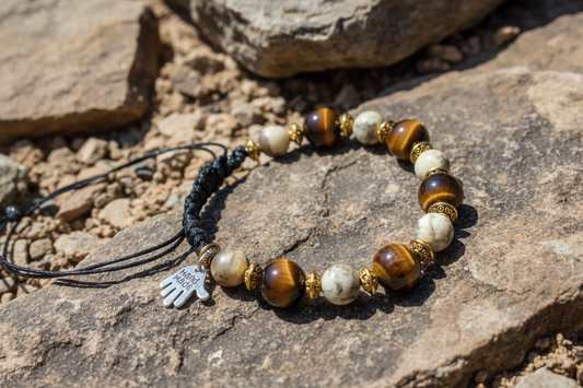 Natural Stone Men's Drawstring Bracelet – Tiger’s Eye & Feldspar, 8–10mm - adjustable