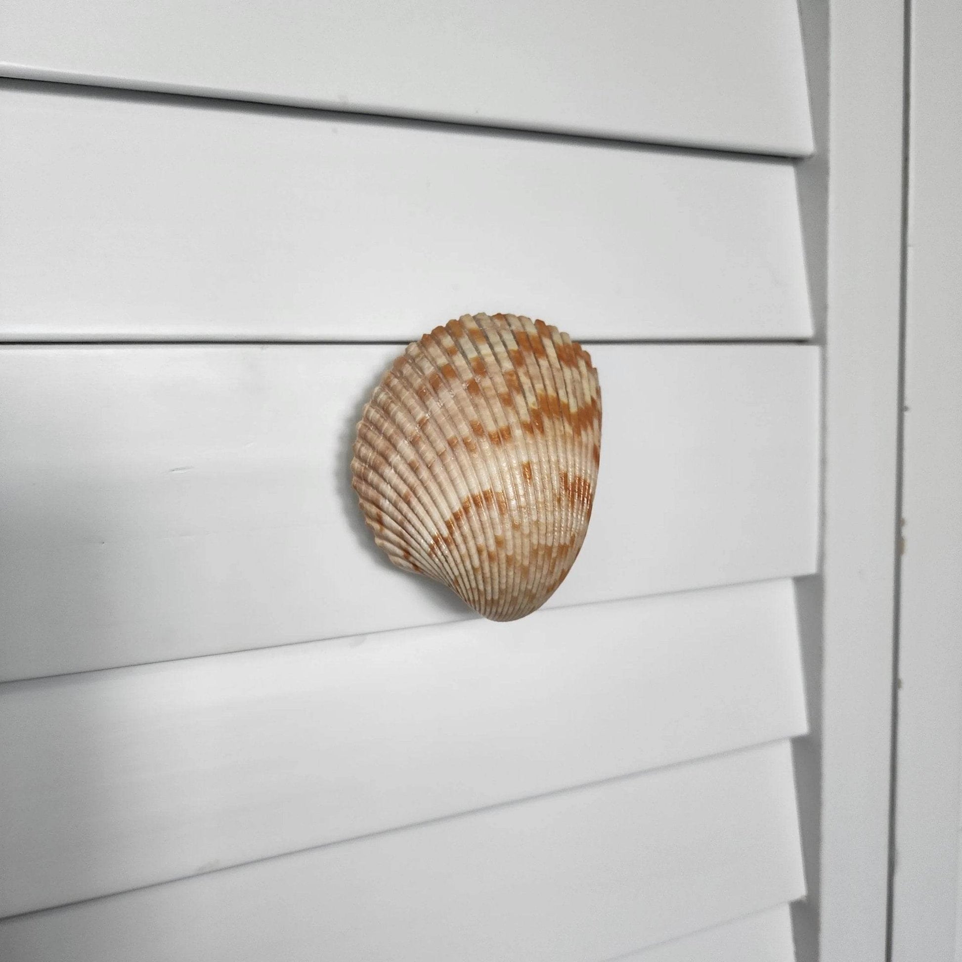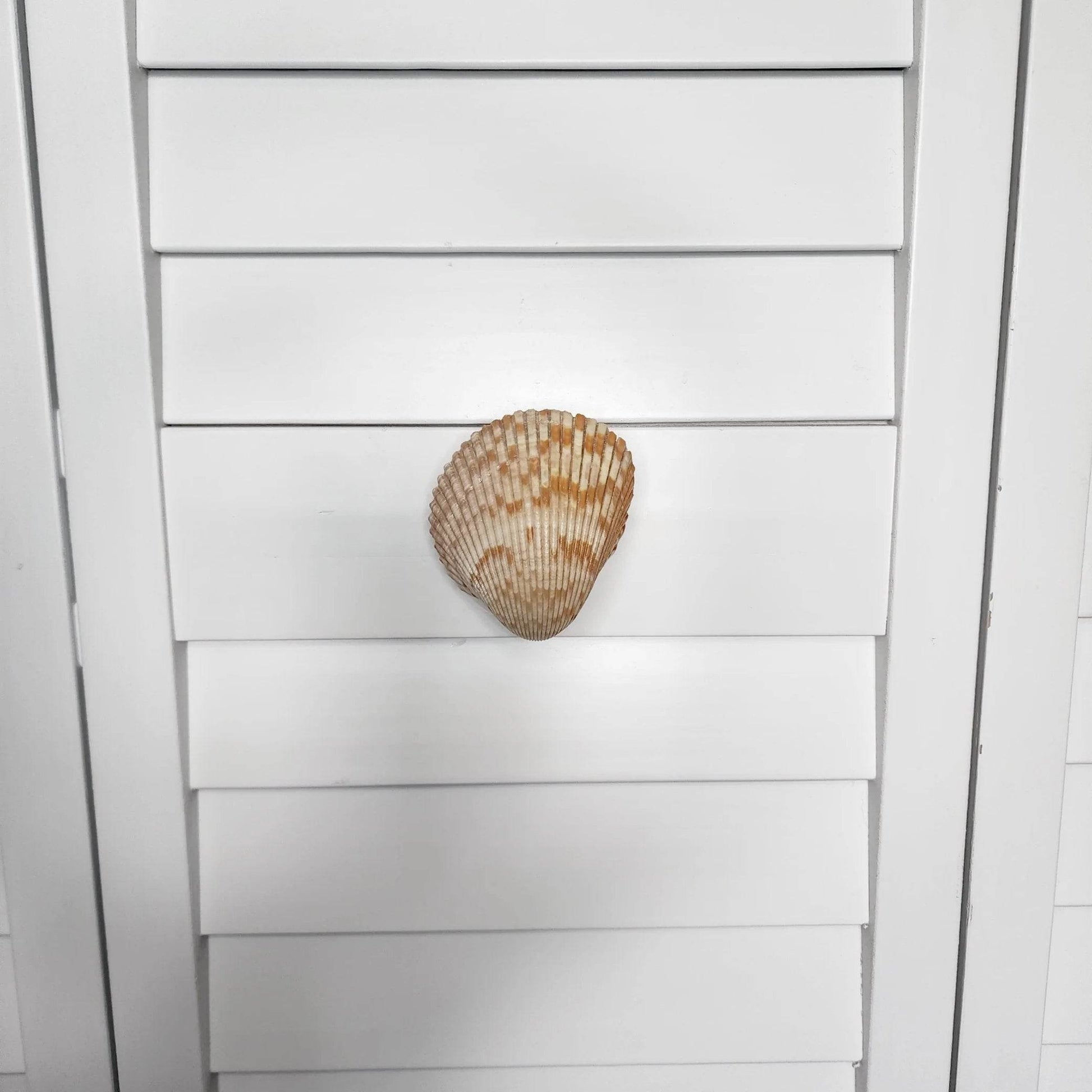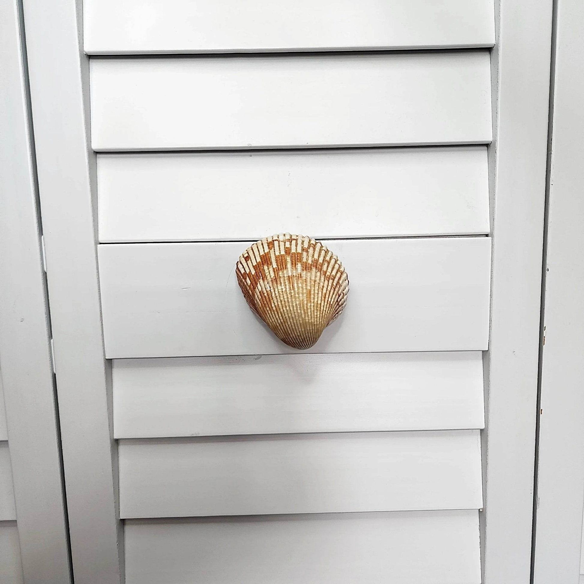 This isn't just cabinet hardware, it's a conversation starter that happens to open drawers. Get TWO authentic cockle shells (because who wants just one fabulous pull?) along 2 1/2' wide and about 2 3/4' long, each has a sleek black metal knob that's permanently set in epoxy. They are slightly off in height, as no shells are completely alike. I will send an extra washer and nut to adjust to you likings if needed.