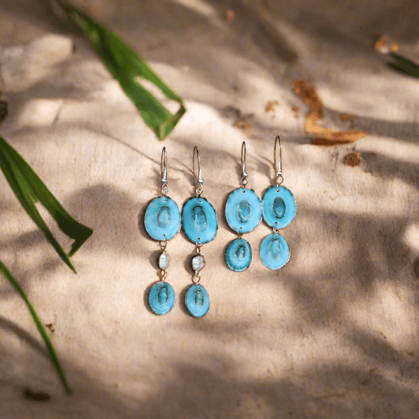 These stunning green limpet shell earrings bring coastal vibes wherever you go. Each pair features genuine sea shells in gorgeous blue-green tones, suspended from quality sterling silver hooks. The natural shell variations make every pair completely one-of-a-kind. Two different variations available, two shell - classic style and two shells with freshwater pearl - elegant. ๐