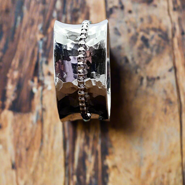 Handcrafted .925 Sterling Silver Spinner Ring with Hammered Texture & Bead Detail | Boho Statement Jewelry