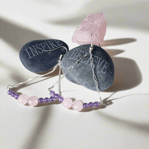 Handmade Sterling Silver Boho Earrings with Rose Quartz & Amethyst Beads | Love & Harmony Jewelry