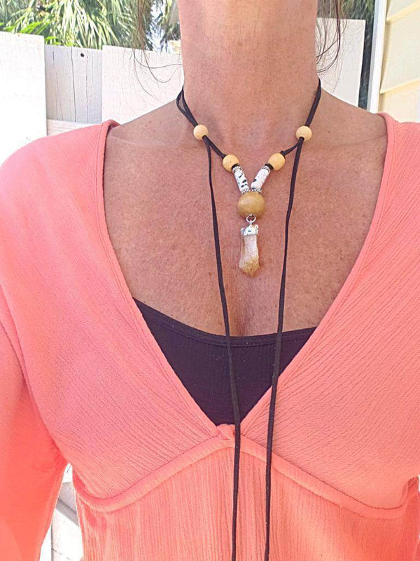 Step into your power and shine bright like the sun with this stunning long black faux leather Boho necklace. Handmade and totally adjustable, this beauty lets you create the perfect look by moving the side cords. At the center, you’ll find a show-stopping Citrine nugget, silver electroplated to add a little extra sparkle to your life. Each side of the stone is adorned with a mix of silver barrels, chic black/white marbled Peruvian Ceramic beads, and earthy natural wood beads. Whether you rock it as a pendant or get wild with different lengths, this necklace is the perfect accessory for your boho soul. Natural wood beads, in various sizes, are scattered throughout the leather rope, while the ends are finished with a stylish combo of silver barrels and ceramic beads.