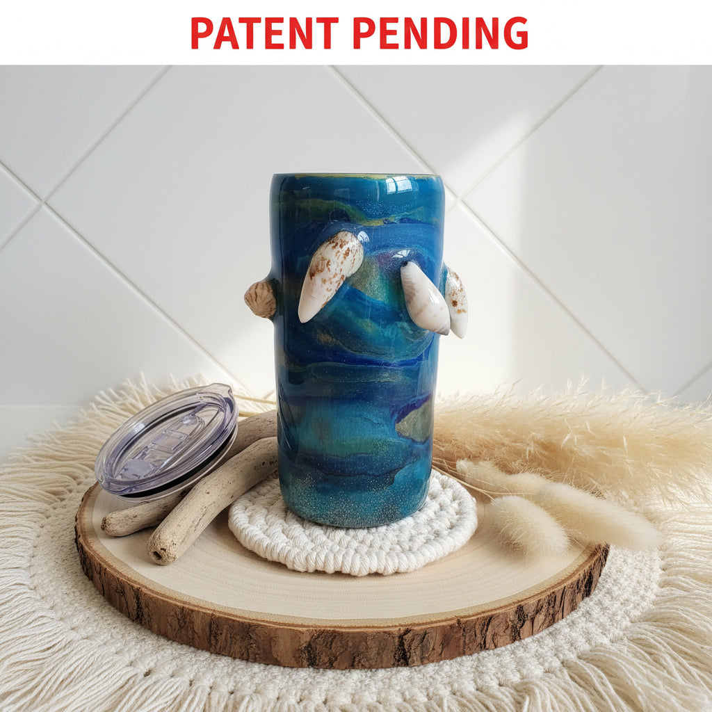 Six authentic Florida seashells (1½" to 2½") appear suspended in swirling ocean waves - deep blues, turquoise, and seafoam green. Our differential embedding technique positions each shell at different depths within the multi-layer resin, creating genuine 3D dimension. Rotate the tumbler and watch the shells shift perspective against the wave backdrop - it's the feeling of snorkeling off a Florida beach, captured in functional art.